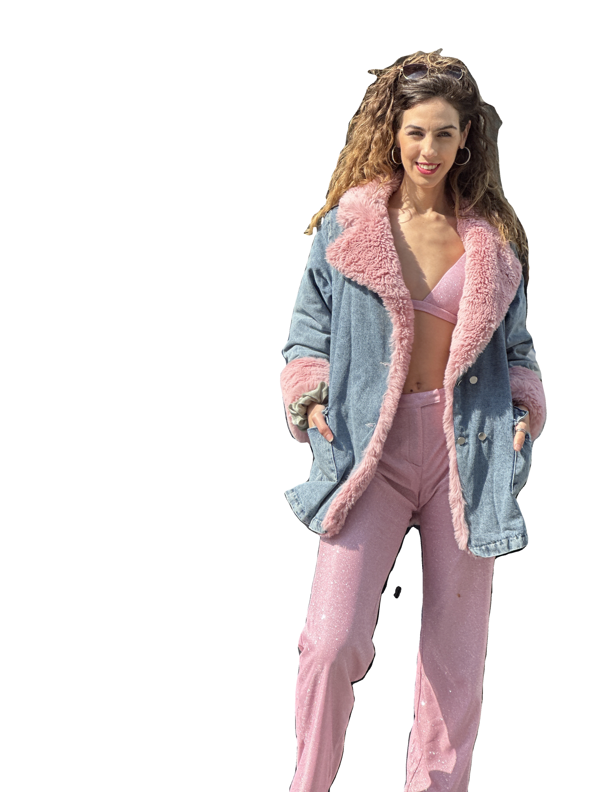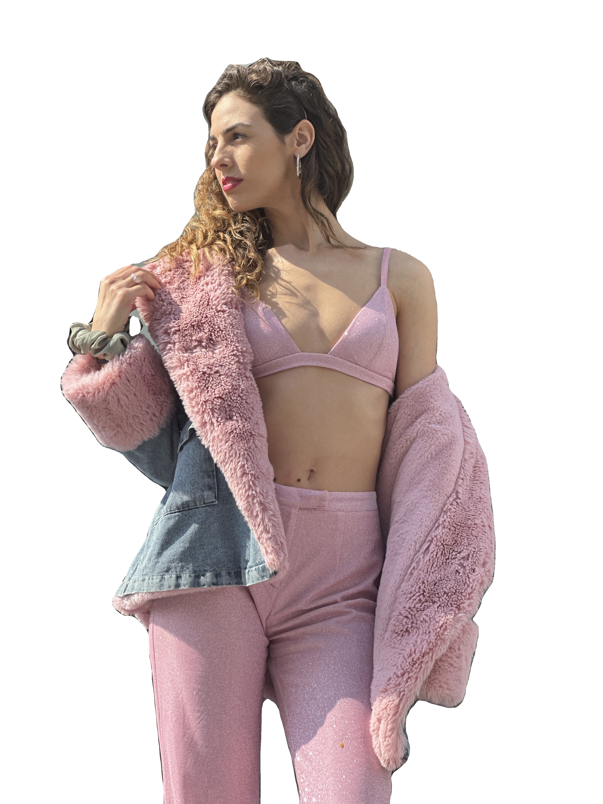 Cropped Jacket: A plush, fur-like collar in a lighter pink shade adds a luxurious touch to the cropped jacket, which is finished with long sleeves and a soft, corduroy-like texture.