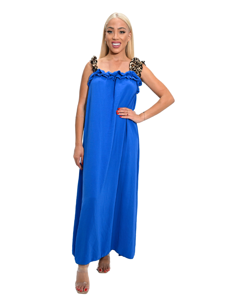 Unveil a touch of wild sophistication with this stunning royal blue maxi dress, perfect for any fashion-forward wardrobe. The dress features a vibrant blue hue that exudes confidence and style. Designed with a flattering sleeveless cut and a gentle scoop neckline, it offers both comfort and elegance. The standout detail is the bold leopard print accents on the shoulder straps, adding an unexpected twist to the classic silhouette. This floor-length gown flows effortlessly, creating an elongated silhouette that’s both graceful and eye-catching.