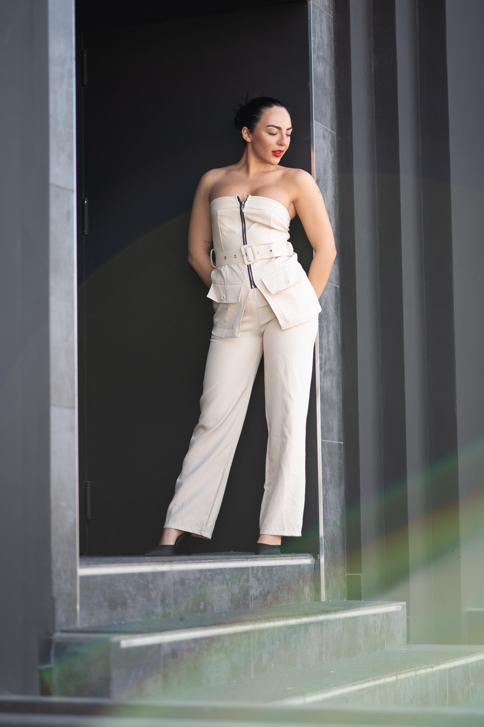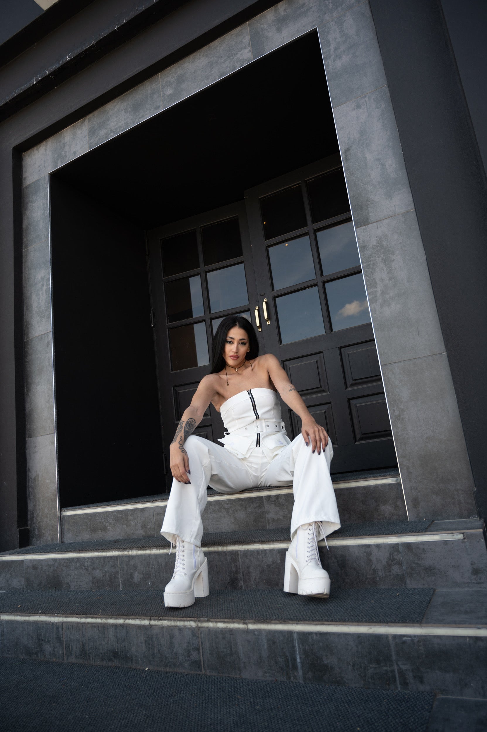 Strapless Corset Top: A structured bodice with visible boning and a full-length front zipper, meticulously designed to contour and enhance.